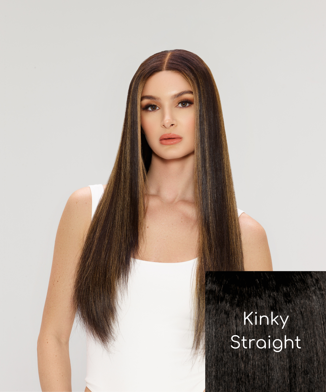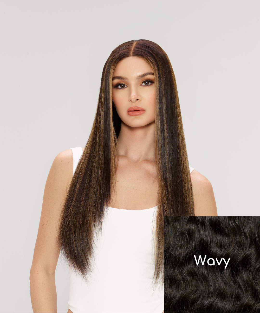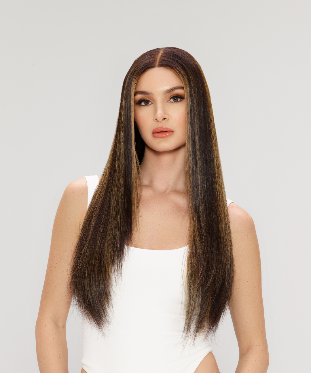 Get ready to shine with our natural toned dark brown wig, featuring radiant highlights in a light warm blonde shade. Embrace your natural beauty with this effortlessly chic look that transitions seamlessly from day to night.