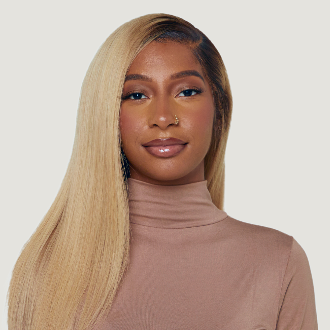 Signature Style No. 7 is a Very Straight Blonde HD Lace Wig with a Dark Rooted Blonde color service in 14 inches.